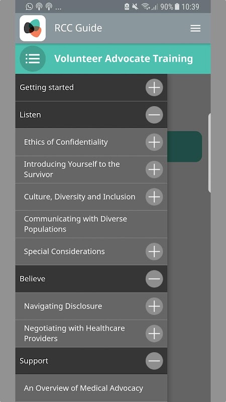 對於志願者的培訓提倡應用程序的部分涵蓋基本醫療宣傳和包括有關如何導航法醫檢驗,這是收集證據,可後來在法庭上使用必要的治療概述和細節。有安全規劃,並與親密伴侶暴力的倖存者的工作部分,以及特殊考慮,例如,對於LGBTQIA社區和藥物性侵犯的倖存者材料。