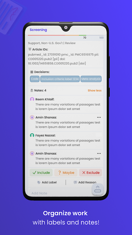 與其他研究人員進行即時協作從未如此簡單。 Rayyan 為您記錄每一個決定。該應用程式甚至可以在您離線時運行,因此您始終可以依靠 Rayyan 來充分利用您的寶貴時間。