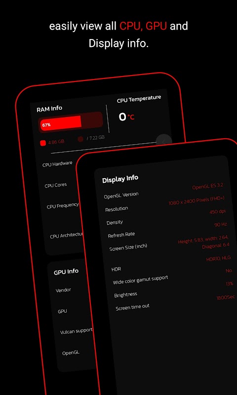 主要功能: 🎮 螢幕上的即時 FPS 儀表 - 使用浮動覆蓋顯示器追蹤任何應用程式或遊戲中的幀速率,顯示精確的每秒幀數指標 📊 遊戲 FPS 監視器 - 專門針對流行的移動遊戲和競技遊戲性能跟踪進行優化 📱 屏幕驗證率監視器 - 即時驗證設備的實際刷新率完整的 CPU 資訊 - 監視器處理器溫度、架構、核心數量和即時頻率統計數據,以了解您設備的處理能力 🎨 詳細的 GPU 資訊 - 查看您的圖形處理器規格,包括 OpenGL 版本支援和圖形性能指標 ⚙️ 全面的設備性能分析,具有易於理解的性能和實時跟踪 🔧 加總數據 - 可調整的顏色同時監控幀速率和刷新率 - 高精度圖形性能跟踪 - 詳細的分辨率和顯示器的密度信息 - 對電池和性能的影響最小 適合: - 想要優化遊戲體驗的遊戲玩家 - 測試應用程序性能的開發人員 - 驗證設備規格的技術愛好者 - 實時識別性能瓶頸 - 比較不同設置和應用程序的性能信息