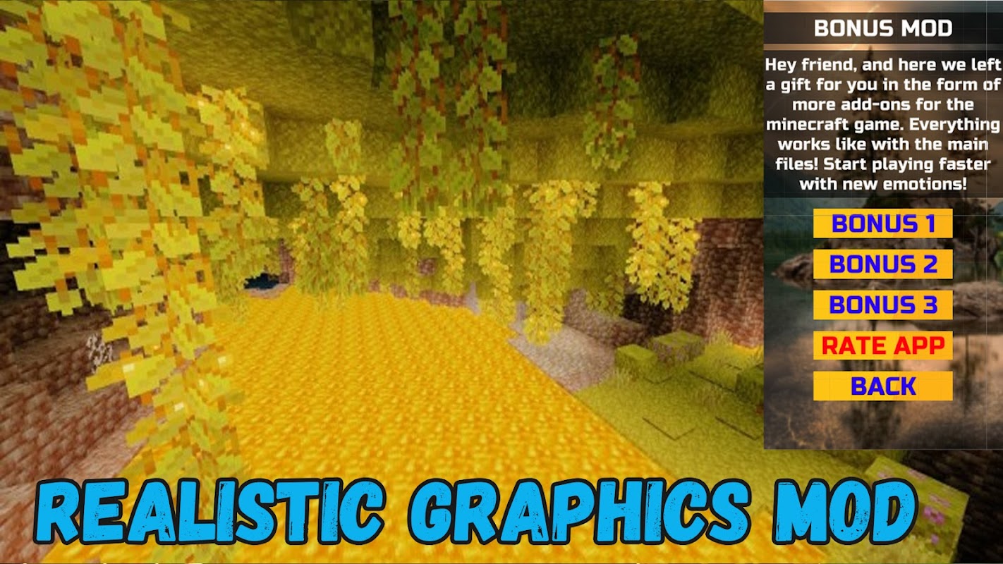 "This Realistic Graphics addon for MCPE app will help you install mods for Minecraft Poket Edition quickly and easily. It has a number of advantages: 💥