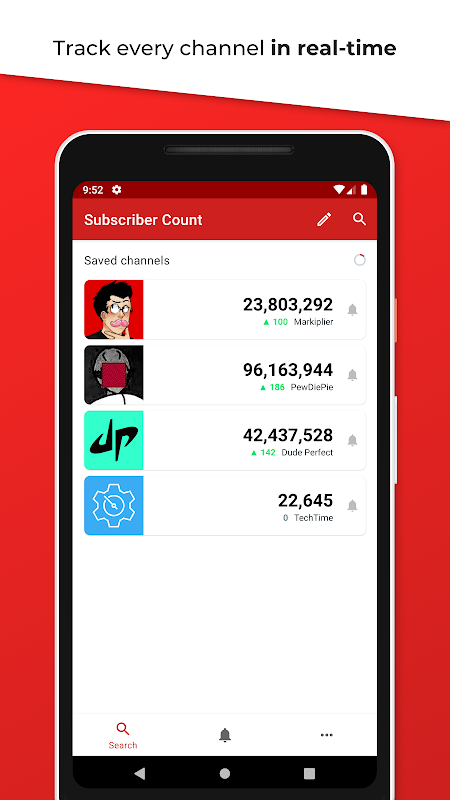 實時訂戶計數包含許多功能,而不僅僅是主流訂戶計數器。它可以讓您保存自己喜歡的頻道,以便您始終可以通過打開應用程序快速瀏覽其訂閱者人數!您甚至都不需要單擊任何東西,只需打開應用程序即可。