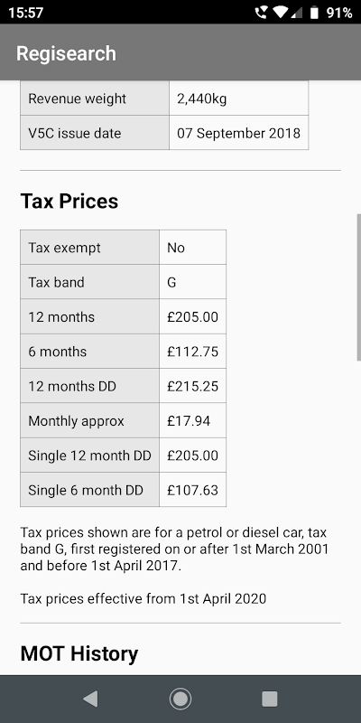 當您在應用程序上進行搜索時,會查詢 DVLA 和 DVSA 服務器,如果返回數據,則會顯示該數據。稅收價格由返回的車輛數據、製造年份、註冊年份、二氧化碳排放量等決定。