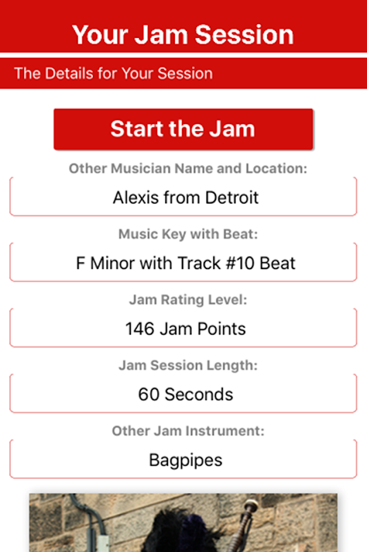 Jam sessions last for 1 minute and occur between different musicians playing different instruments. Players are synced over the internet using a music key and jam beat. The app comes with hundreds of jam beat and music key combinations.