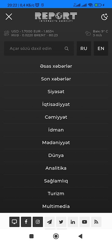 “報告”獨立新聞機構通過其網站和日報及時向讀者傳達阿塞拜疆語、俄語和英語的政治、經濟、社會、體育和文化領域中最重要的事件。特別是,與阿塞拜疆和世界發生的過程相關的分析材料顯示在網站的“分析”部分。