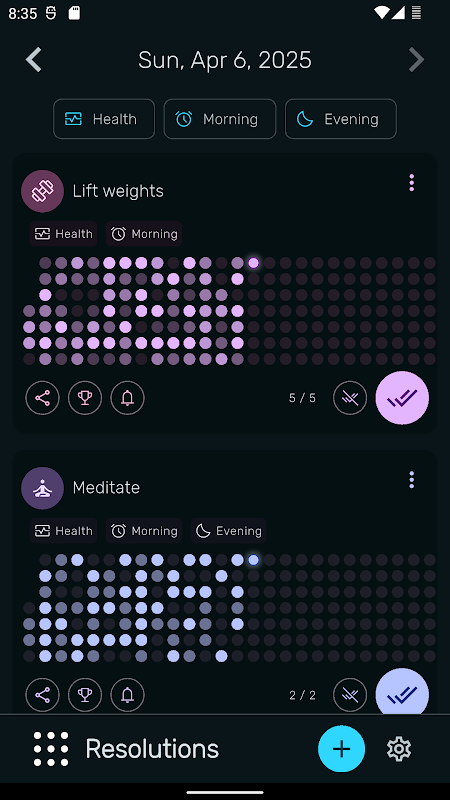 Resolutions 是一款簡單易用的應用,可協助您輕鬆追蹤生活變化。無論您是想改變生活方式還是養成新習慣,Resolutions 都能幫助您輕鬆實現目標。從開始冥想、鍛煉,到戒掉垃圾食品,Resolutions 都能幫您記錄進度。透過色彩鮮豔的熱力圖,您可以快速查看自己的進度。