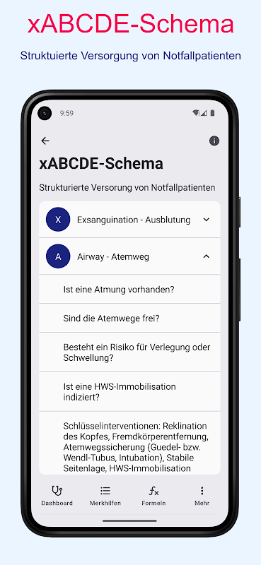 有了這個應用程序,第一次可以計算心率和呼吸頻率。該應用程式會根據節拍自動計算頻率,並推斷出每分鐘的頻率。還可以收集 qSofa 分數、APGAR 分數和 GCS。助記符包括 ABCDE、SAMPLERS 和 OPQRST、IPAPF、ATMIST、ISBAR、CLOUD、REPORT、BASICS、PECH 和 4Hs&HITS,以及 BE-FAST 等。公式集合中包含氧氣計算器、PY 計算器、灌注器劑量計算器、九分法、平均動脈血壓計算器以及 Baxter-Parkland 和 Brooke 公式,有助於保持冷靜的頭腦。互動式心電圖位置類型工具可以更輕鬆地確定心電圖中的位置類型。