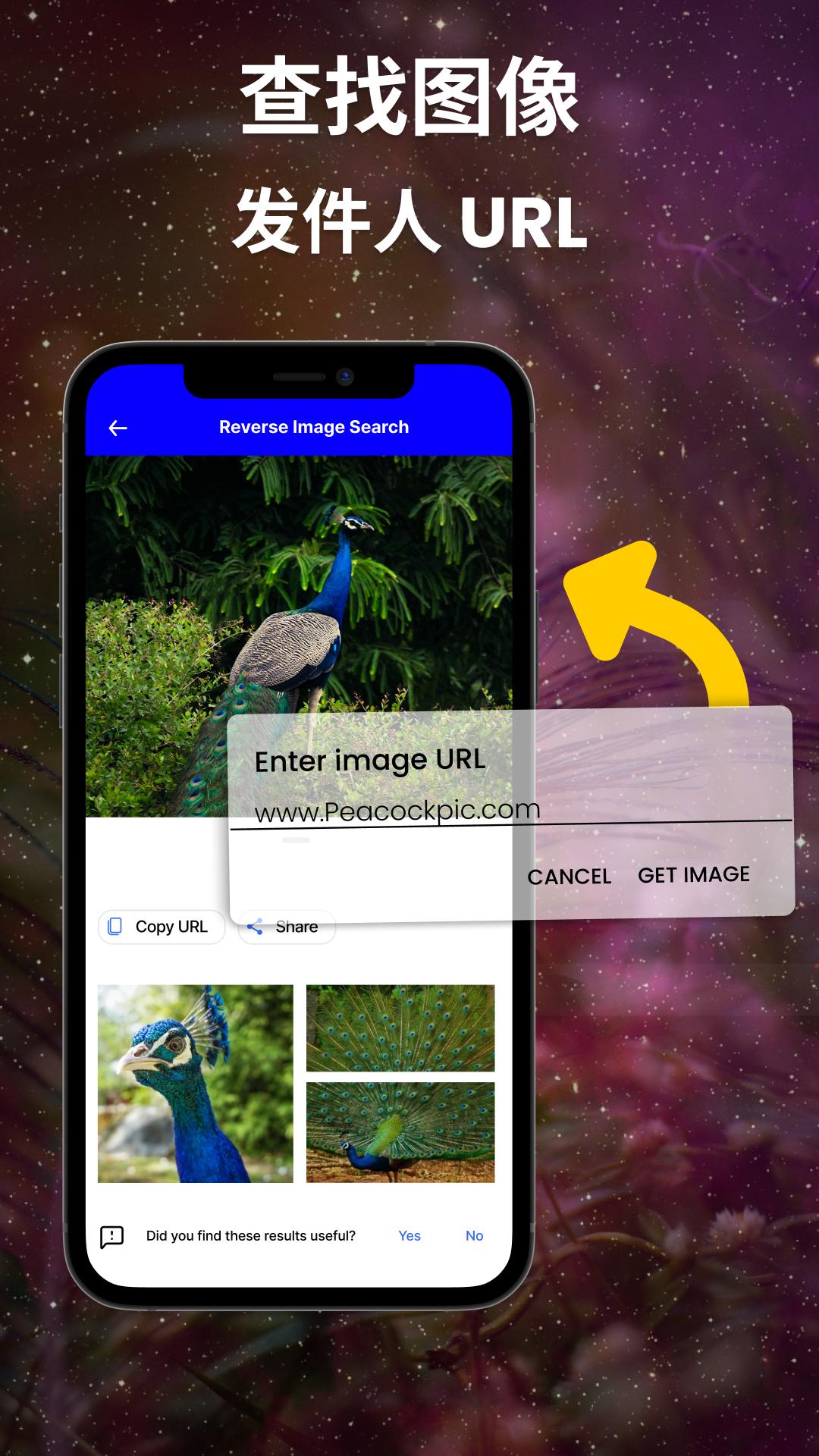 反向图像搜索应用中的 URL 模块允许用户通过直接在应用中输入图像的 URL 来查找信息或类似图像。此功能允许快速轻松地进行需要下载图像的反向图像搜索,使其成为研究人员、设计师以及任何从网络寻求详细图像见解的人的便捷工具。