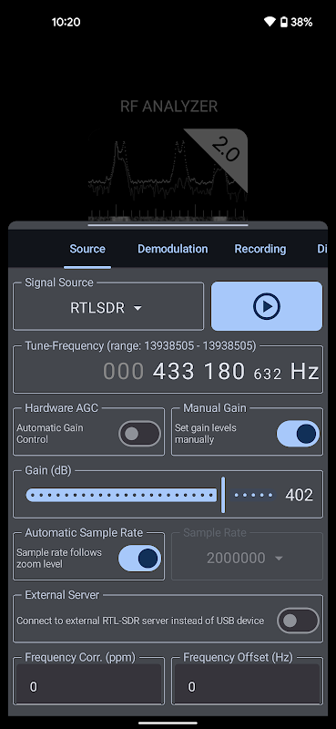 RF Analyzer 將您的 Android 裝置變成一款適用於軟體無線電 (SDR) 的即時頻譜分析儀。您可以查看並聆聽周圍的無線電訊號,從業餘無線電到廣播訊號,甚至更多。