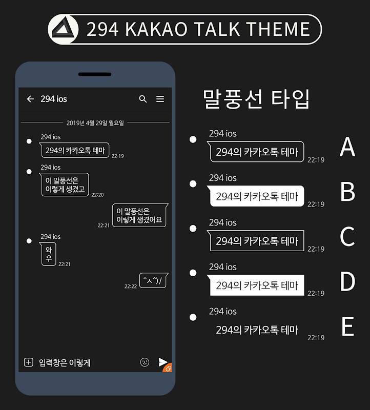RGB-S 시리즈 테마는 타입 A,B,C,D,E 의 총 다섯가지의 말풍선 스타일로 원하시는 스타일을 골라서 사용하실 수 있는 테마입니다.