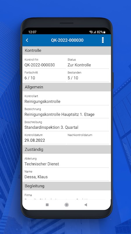 使用 QualityControl 應用程序,可以執行移動或電子質量控制,例如B. 技術系統的清潔或維護是否正確並記錄在案,或者公司自有財產上的受保護樹木是否得到妥善照顧。