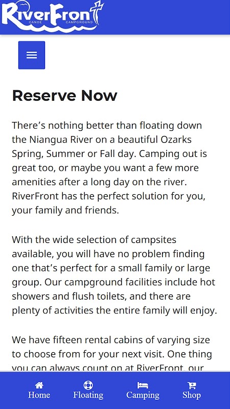 River Front Campground and Canoe Rental is located on the banks of the Niangua River, adjacent to Bennett Spring State Park, a nationally famous trout fishing haven. We offer over 200 acres of prime campsites fronting the clean and beautiful Niangua River. Wheel in your RV or pitch a tent, you’ll find the camping experience at River Front to be both peaceful and memorable. We’re family owned and family friendly, so bring the whole crew along for a vacation or weekend outing.