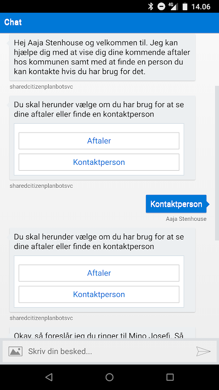 Dette er en chatbot udviklet af KMD som giver mulighed for at man som borger kan se sine aftaler og kontaktpersoner hos kommunen. For at få adgang kræver det, at en kommunal medarbejder sender et personligt link via SMS.