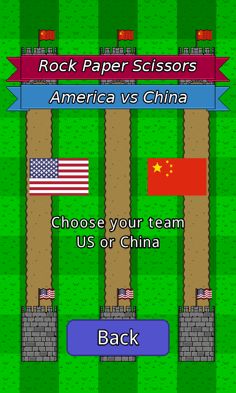 Choose your side (America or China) and then arm your soldiers with rock, paper or scissors. The soldiers will march towards each other, clash and the winner of the battle will face the next soldier deployed from their opponent's castle.