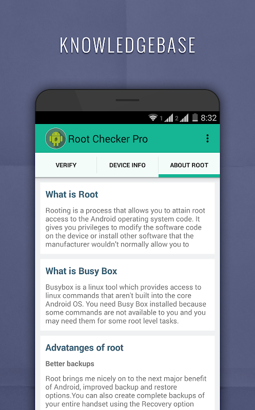 This application will test your device for busy box and root access using a very simple, quick and reliable method without requiring root access. The su binary is the most common binary used on Android devices to manage and grant root access. Root Checker Pro will check and verify that su binary is located in a standard location on the device. Root Checker Pro will also confirm the proper permissions and flags on the su binary in addition to testing that access is granted by the su binary.