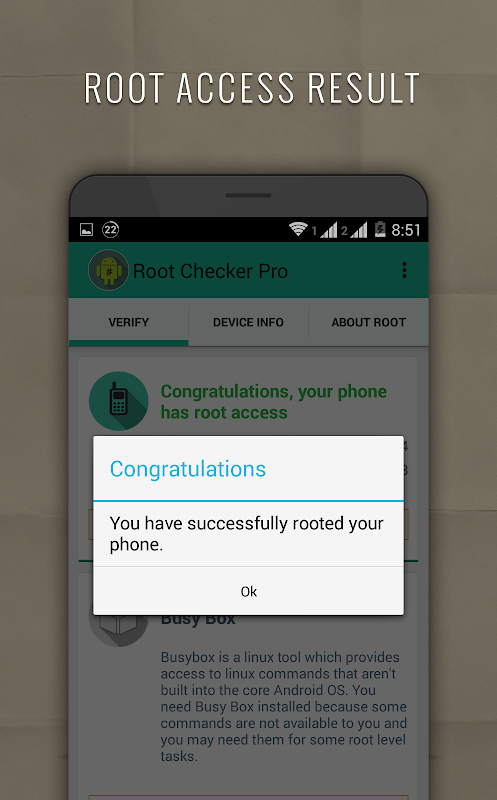 The goal of this application is to provide the newest Android user with a simple and reliable method to check their device for root (administrator/superuser) access and allow user to check busy box. This is a very simple and easy to use application to notify the user whether or not they have properly setup root (superuser).This application will also allow user to check installation of busy box with one click.