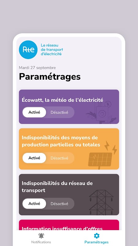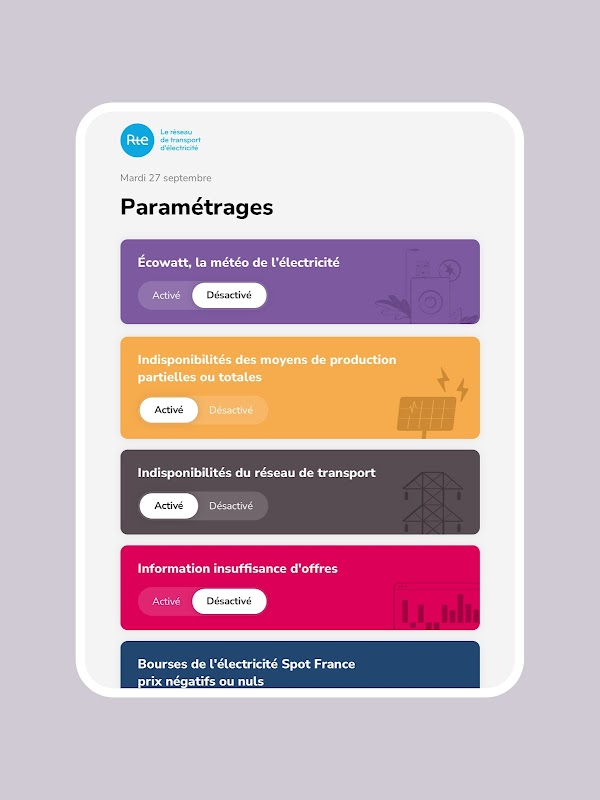 • Ecowatt,電力天氣預報:真正的電力天氣預報,Ecowatt 實時描述法國人民的消費水平。在任何時候,清晰的信號都會引導消費者採取正確的姿勢,並確保為所有人提供良好的電力供應。這些信號以 3 種顏色的形式出現:綠色、橙色和紅色。在 D-1 上發送通知以指示橙色或紅色信號。