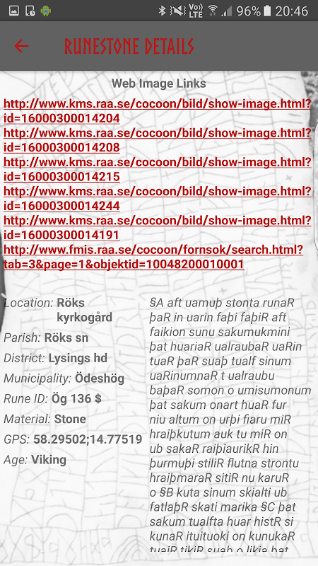 該應用程序圍繞“斯堪的納維亞符文文本數據庫”構建,將列出保存在任何材料上的符文銘文,包括石頭,金屬和木材。應用程序嚴重依賴於位置信息,列表和地圖視圖均與您的位置有關。包括廣泛的搜索功能,作為避免每次都要使用整個數據庫的設置。