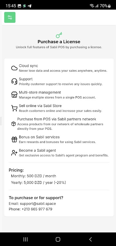 Sabil POS 可將任何安卓裝置變成完整的 POS 解決方案。無需複雜的硬體或冗長的培訓,即可新增產品、記錄銷售、接受多種支付方式並追蹤業績。無論您管理的是小型店鋪還是多家分店,Sabil POS 都能讓您清晰掌控一切。