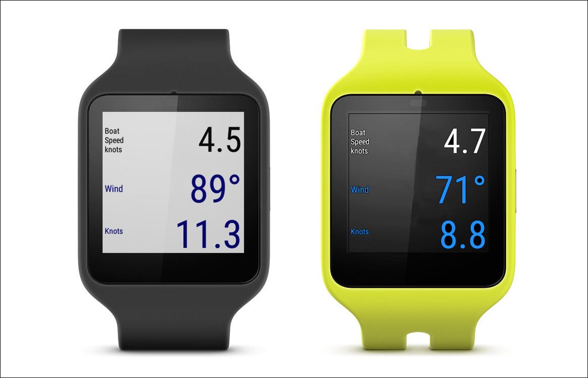 您還可以在此應用程序中使用智能手錶。索尼 Smartwatch 3 是一個不錯的選擇,因為它防水,並且具有在陽光直射下可見的反射屏幕。在小型帆船上,您可能沒有在羅盤或儀表板上安裝屏幕,只需檢查手錶即可查看風角、風向、風速和船速。當 Wind Gauge 應用程序位於平板電腦/手機的前台時,您在屏幕上的任何參數都會同時顯示在手錶上。在手錶屏幕上向左滑動可進入設置屏幕,具有 5 秒的調暗和亮度控制。