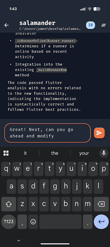 透過 AI 的強大功能,您可以隨時待命於電腦前。即使遠離鍵盤,也能保持高效率。借助 Anthropic Claude CLI 的支持,您可以將手機連接到電腦,從而增強工作流程並優化輸出。建立一個運行程序,選擇一個目錄,然後與您的 AI 開始對話。在 AI 工作的同時,您可以外出做自己喜歡的事情;當 AI 完成工作後,它會向您發送推播通知,為您準備下一個任務。即使您不在電腦前,您的 AI 也會在您的電腦旁隨時待命,隨時準備執行任務。