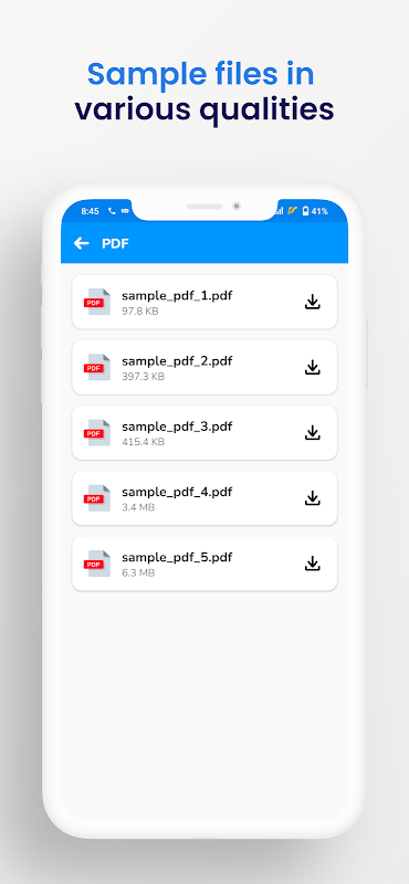 隨時隨地免費下載測試檔。非常適合用於 Android、iOS 和 Web 應用測試。節省手動收集格式的時間—這款應用程式將所有內容集中到一處。
