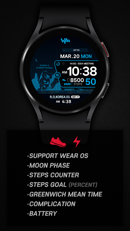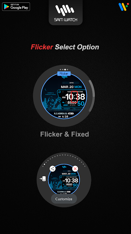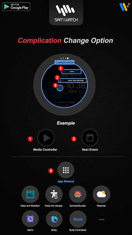 *智能手機應用程序是錶盤應用程序中的附加應用程序,用於解釋下載指南。它可能與智能手機應用程序的錶盤屏幕截圖和實際下載的錶盤屏幕截圖不同。 SamWatch 的大部分錶盤應用程序產品都包含智能手機應用程序。