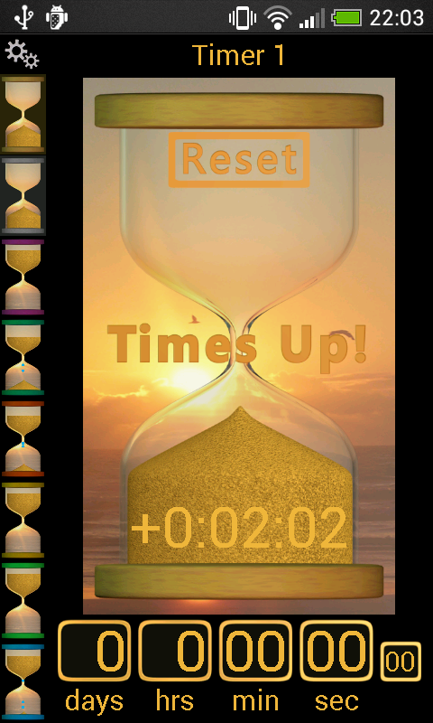 同時操作最多 8 個沙漏定時器(每個沙漏定時器的顏色不同,並在螢幕左側進行選擇)。