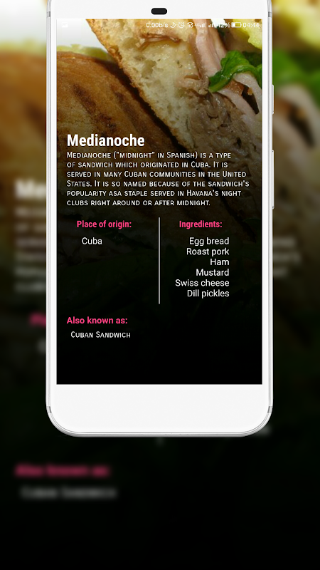 這個應用程序為用戶提供了世界各地的一些三明治類型與自己的形象,名稱,簡短描述,產地,成分和它們不同的名稱。
