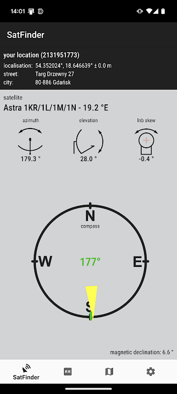 3.方位角,仰角和傾斜角計算您的位置和所選擇的衛星。在計算值有一個與方位角的圖形表示指南針。方位角計算與磁傾角。記住 - 每次使用指南針的時間 - 你應該校準。綠線代表你的手機的方位。所以,如果指南針綠色和紅色指標是相互 - 手機正面應該表現出你的方向到衛星。如果指南針值是正確的 - 手機方位角值將走向綠色。