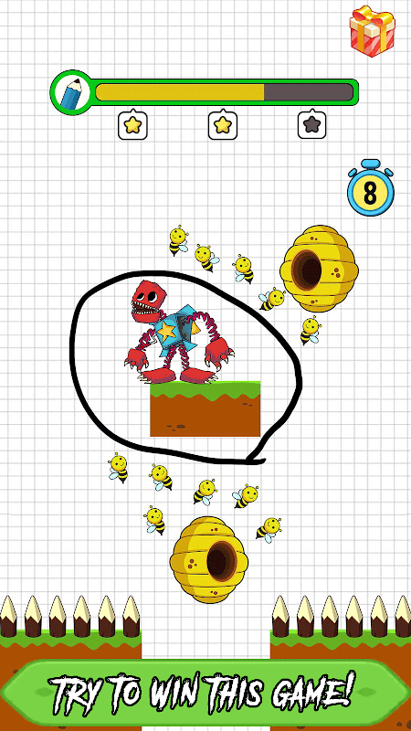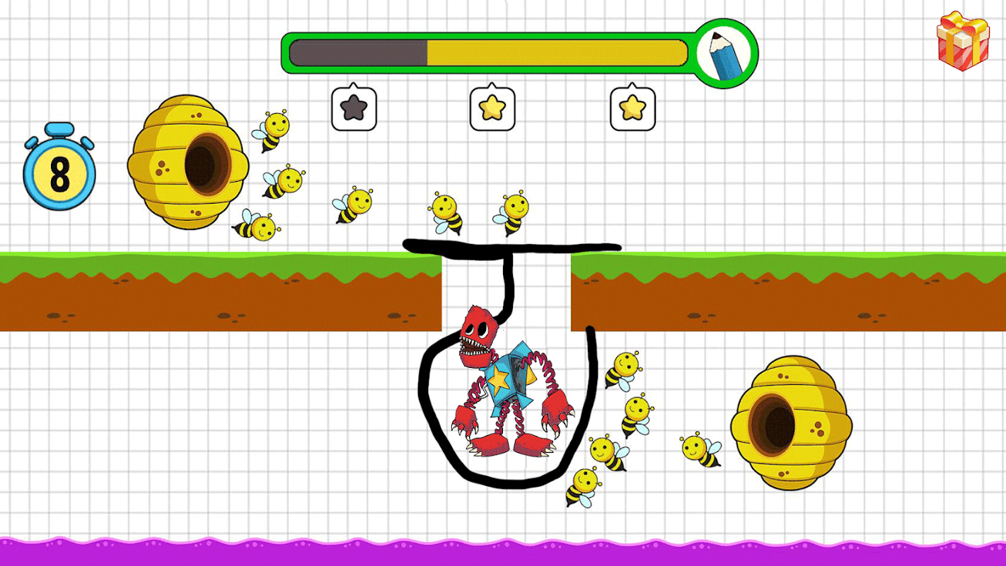 點擊以畫一條線並從蜜蜂的攻擊中拯救四四方方的噓聲:按下以畫出你的線。確保你的線不會傷害你需要保護的藍色怪物。