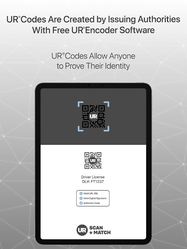 免費的 UR 代碼(特殊生物識別條碼)掃描器可以包含駕駛執照、護照、信用卡和許多其他文件的資料。該應用程式可讓您將 UR 代碼中的編碼臉部資料與另一張臉部進行匹配,並提供臉部匹配等級並驗證數位簽名,以證明條碼中儲存的個人資訊的不變性。