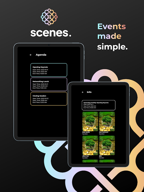 歡迎使用 Scenes,這是 First Impact 開發的權威活動應用程序,專為企業界設計。透過 Scenes,您可以輕鬆參與備受矚目的企業活動。
