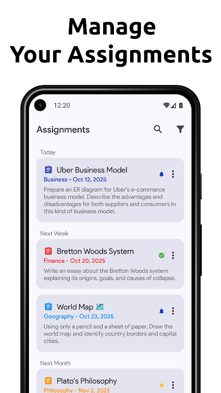 School Planner 旨在幫助您輕鬆直觀地跟踪所有作業。您可以按日期、課程或優先級對作業進行排序,也可以按已完成或未完成對它們進行排序。