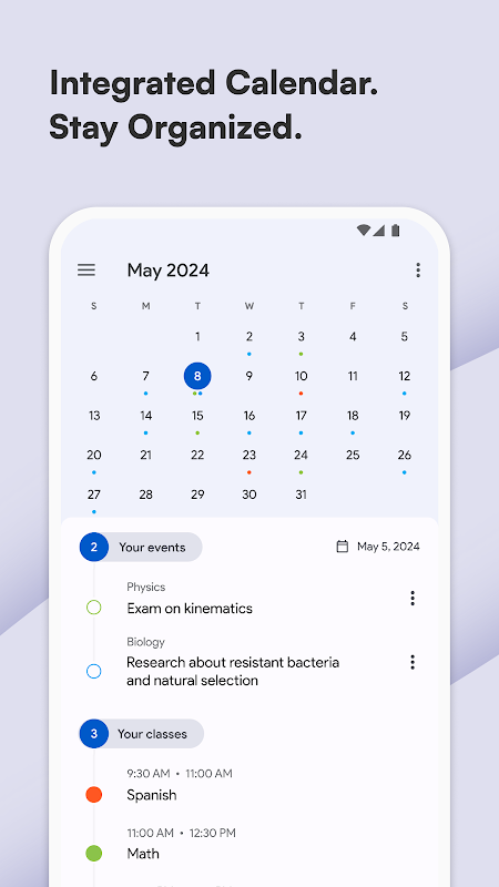 寫下功課,作業,考試和提醒簡單快速和日常通知,將幫助你永遠不會忘記任何事情。內置日曆高度為學生的需求進行了優化,讓您更輕鬆地管理您的事件和活動。