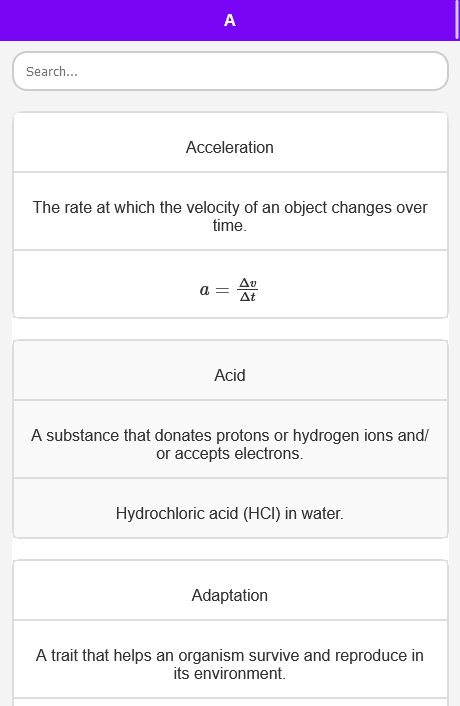 探索數千個精心策劃的條目,每個條目都附有詳細的解釋、實際示例和富有洞察力的方程式。無論您是學生、教育工作者還是科學愛好者,此應用程式都可以為您提供觸手可及的寶貴資源。
