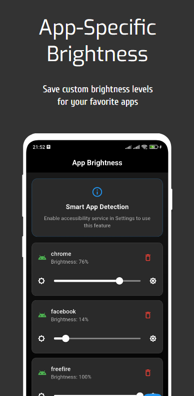 使用亮度控制器,這款功能齊全的 Android 亮度控制應用,全面掌控您的螢幕亮度。無論您是在夜間閱讀、在明亮的陽光下行走,還是只想更好地控制螢幕亮度,這款應用都能讓您精確靈活地控制螢幕亮度和顯示設定。
