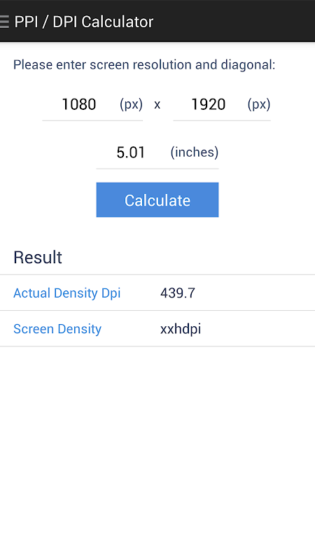 - 通過使用螢幕解析度和對角線計算屏幕密度和DPI(每英寸點數)/ PPI(每英寸像素)。