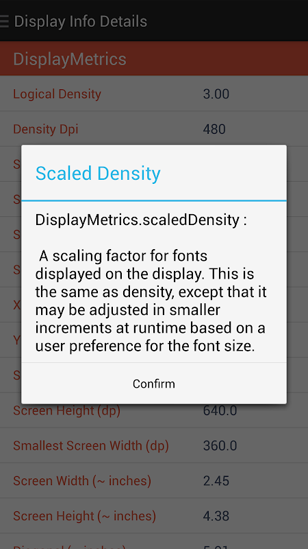 - 當前設備的螢幕分辨率,螢幕密度,螢幕信息,其中包括有 比例,高度,寬度,對角線 ... 並顯示3種不同的單位(像素, DP 和英寸)等