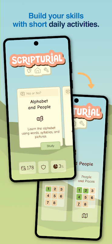 從學習字母和一些基礎詞彙開始。 Scripturial 包含 700 多個練習,使用 10,000 個簡單句子;7,200 個單字和句子的音訊;以及 1,600 多張圖片。 Scripturial 包含約 45 小時的入門內容。每個練習活動預計需要初學者花費 3-5 分鐘。每天完成 3 到 4 個練習,大約 6 個月即可完成整個應用。本應用程式的主要目的是提供分級的、易於理解的輸入,旨在幫助您逐步熟悉聖經希臘文的閱讀。