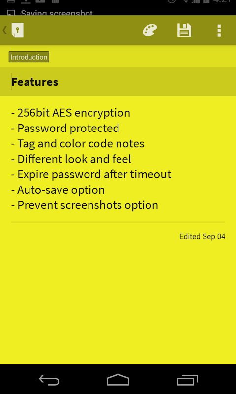 • Since encryption is done at storage level, accessing notes directly from disk is not possible. If you ever lose phone, you won't lose your notes to thieves.