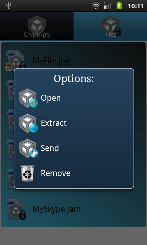 - Send your files by Bluetooth, Google Drive, Dropbox ... so you can share your files encrypted with anyone you like.