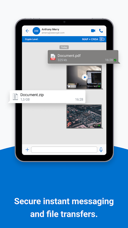 Seecrypt 提供安全的即時消息傳遞,能夠發送照片、視頻、語音註釋和任何類型的大文件。所有消息和文件都使用為發送的每條消息或文件生成的新密鑰進行端到端加密。 Seecrypt 的增強型靜態數據加密可保護應用程序中存儲的所有文件和媒體。