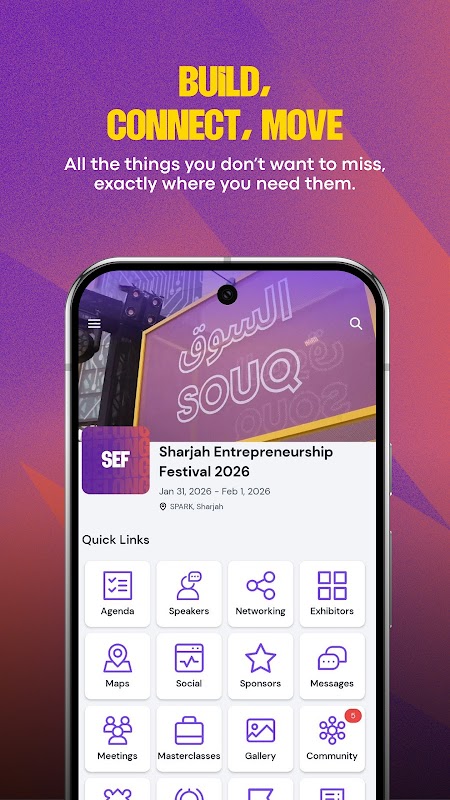 無論您參加沙迦創業節是為了尋找靈感、拓展人脈還是提升自身能力,SEF'26 應用程式都能幫助您清晰自信地暢遊整個盛會。