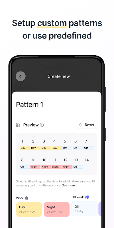 這個應用程序提供了自己的預設工作班次模式列表,您可以立即使用。如果您的輪班工作不屬於這些模式中的任何一種,您可以設置自定義輪班模式並使用它,或者調整和編輯預配置的輪班模式。