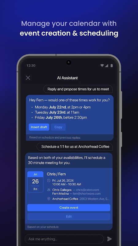 利用人工智慧驅動的日程安排功能,減少處理日曆的時間。建立事件、發送人工智慧產生的日程安排電子郵件、一鍵接受日曆事件等等。