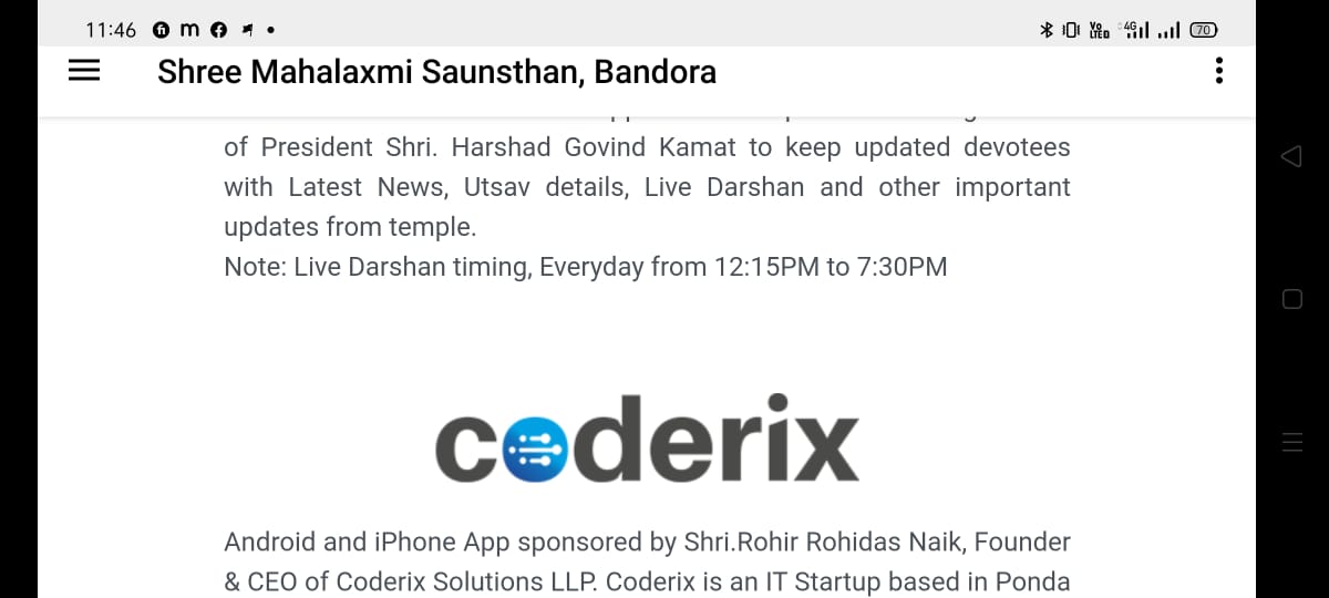 Shree Mahalaxmi Saunsthan's App was developed under the guidance of President Shri. Harshad Govind Kamat to keep updated devotees with Latest News, Utsav details, Live Darshan, and other important updates from the temple.