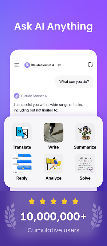透過我們始終可存取的懸浮面板享受即時 AI 互動。無需離開目前應用程式即可聊天、分析螢幕內容、總結資訊或輕鬆從圖片中提取文字。