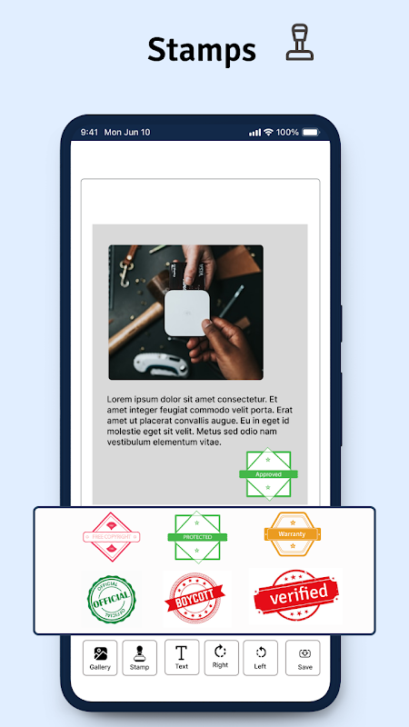• 可編輯圖章:旋轉、調整圖章大小和調整圖章以完美貼合文件或圖像。