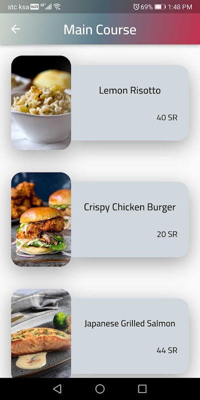من الاطباق تحتوي على اسم وسعر كل طبق، ويمكن للمستخدم اختيار طبق معين وعرض المزيد من التفاصيل حوله