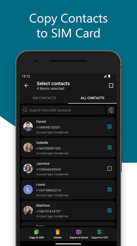 - Delete multiple contacts from SIM Card & device memory.